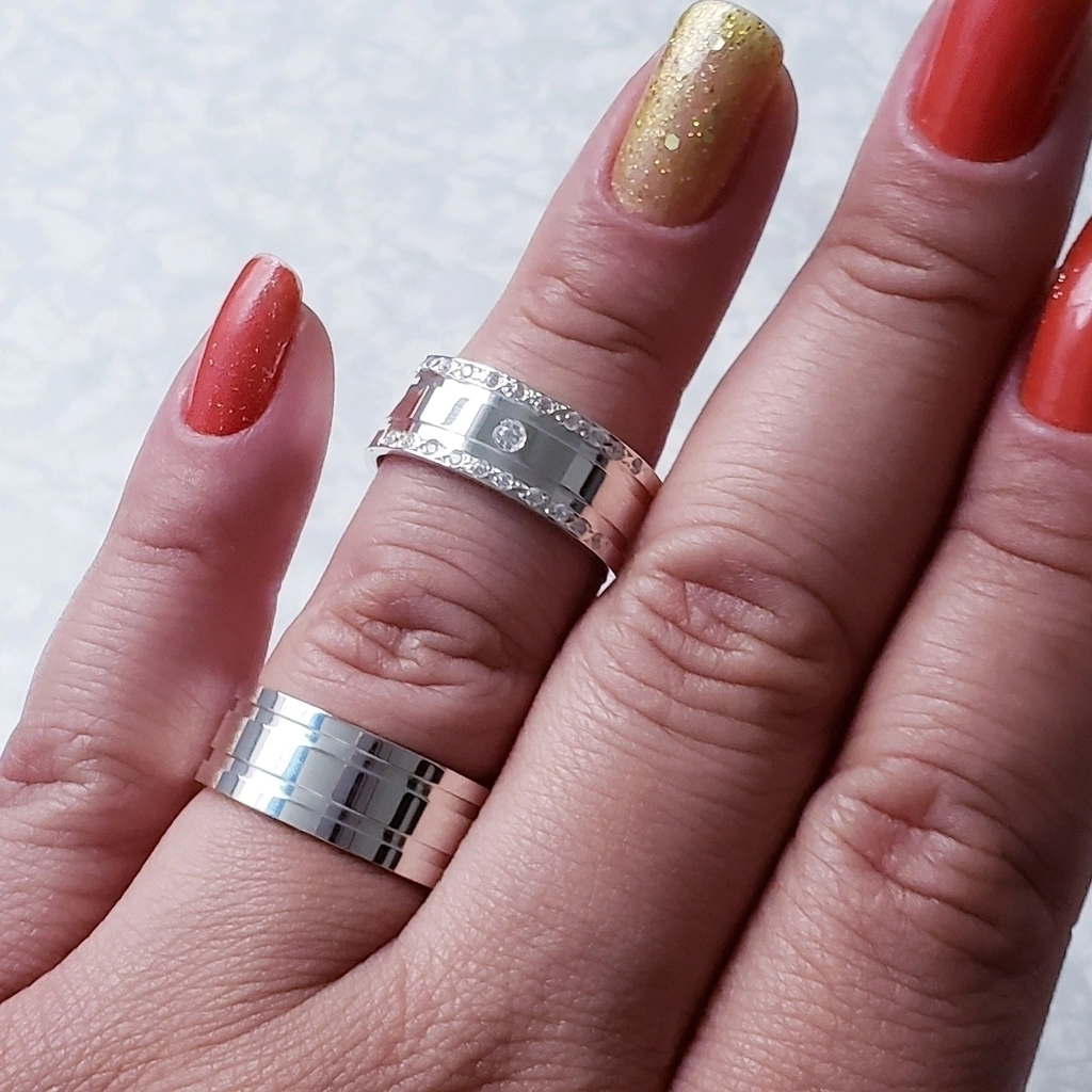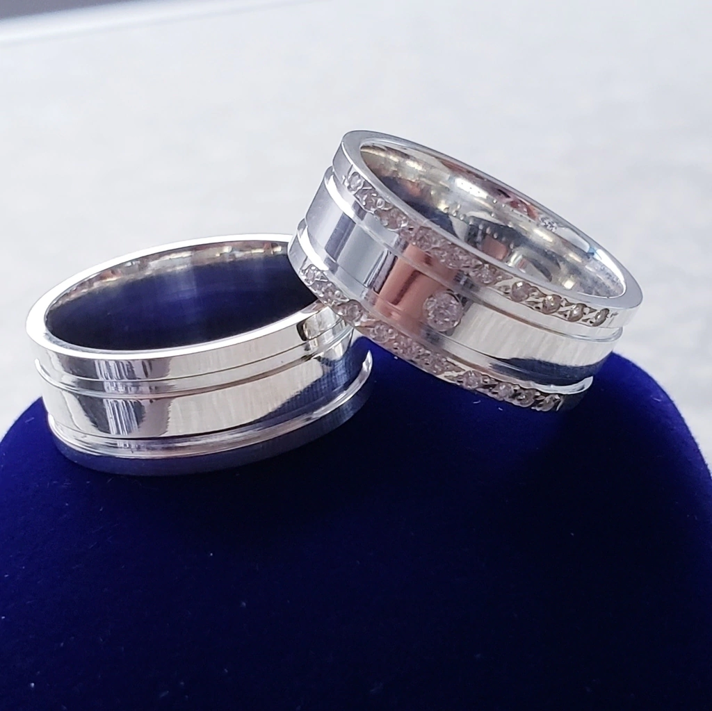 Aliança 1: Reta polida com frizo nas laterais meia volta cravejadas de zircônia e Pedra Central