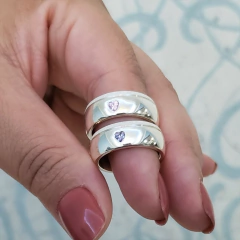 Aliança 2: meia cana polida, faixa diamantada com pedra coração roxa
